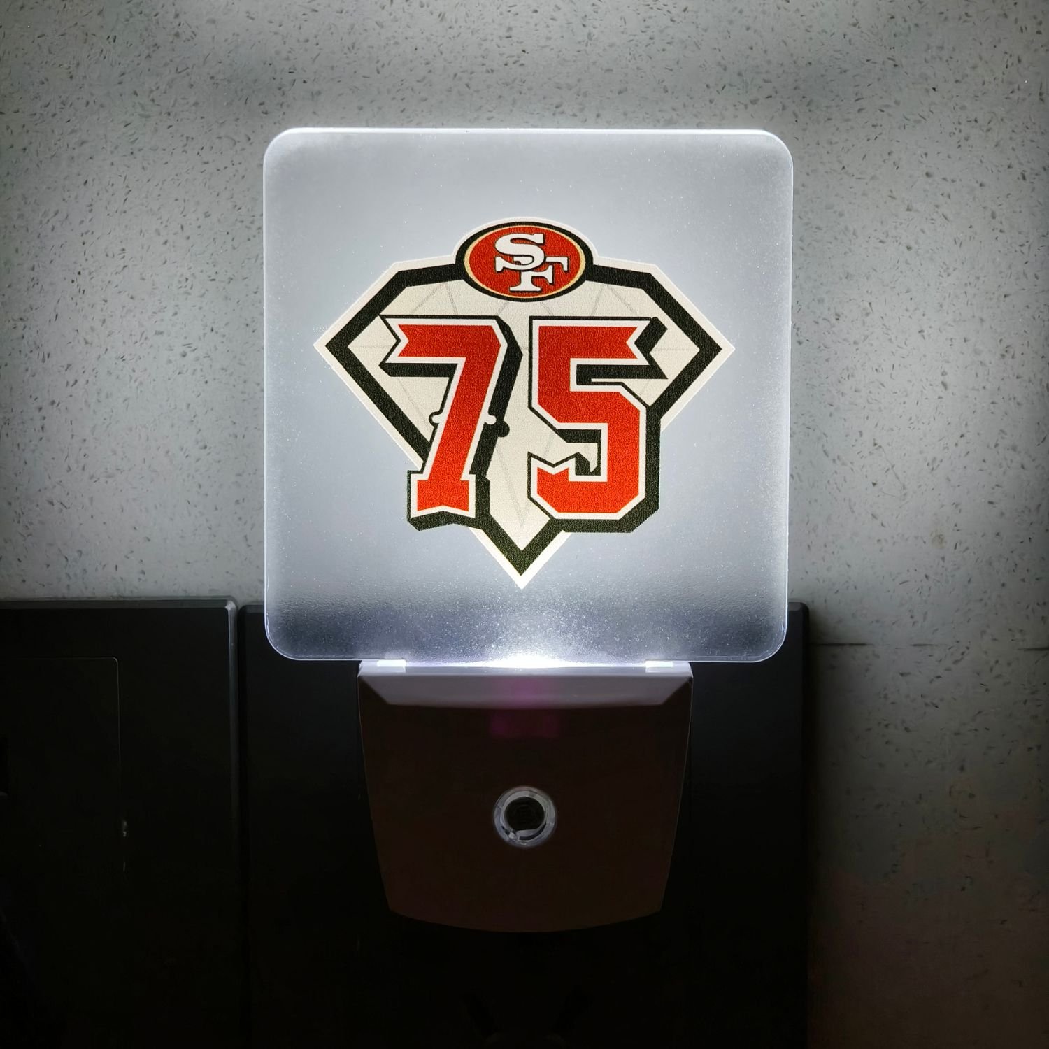 The Night Light Motion Sensor Lamp combines functionality with sleek design. Featuring a bold “SF 75” emblem in red and black, it offers auto-on motion detection, three lighting modes (white/warm white/color-changing), and global voltage compatibility. Ideal as a sports-themed gift, home decor, or commemorative item, blending practicality with personalized style.